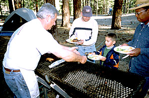 Norm serving chicken to David and Mathew